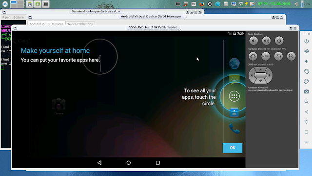 Log out- log in, porniți un terminal și tastați android sau android avd, pe urmă vă descurcați. Prima comandă deshide Android SDK Manager, puteți instala pachete, face update-uri, dezinstala, porni din Tools AVD (Android Virtual Device) Manager, a doua va porni direct AVD Manager. Puteți alege unul din dispozitivele disponibile (Device Definitions), alegeți setările, creați un AVD pe care-l puteți găsi în Android Virtual Device și porni cu Start- Launch.